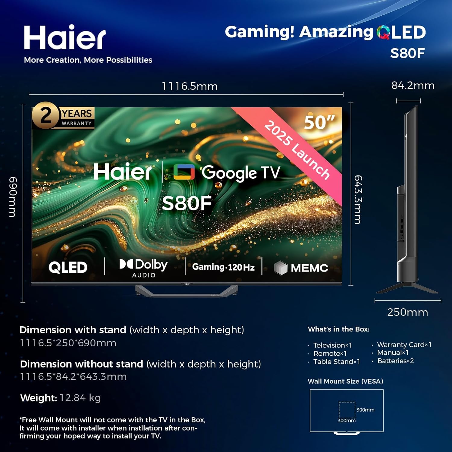 تليفزيون هاير 50 بوصة سمارت جوجل الذكي 120 هرتز 4K QLED H50S80F haier